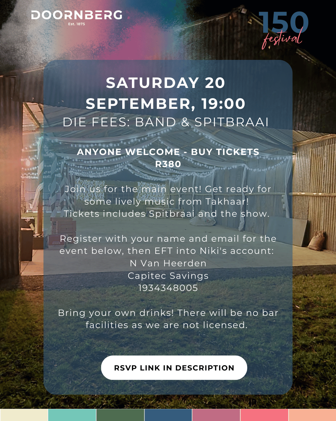 SATURDAY 20 SEPTEMBER, 19:00 – DIE FEES: BAND & SPITBRAAI: https://forms.gle/GBhHWp4FSKRHGeGz8